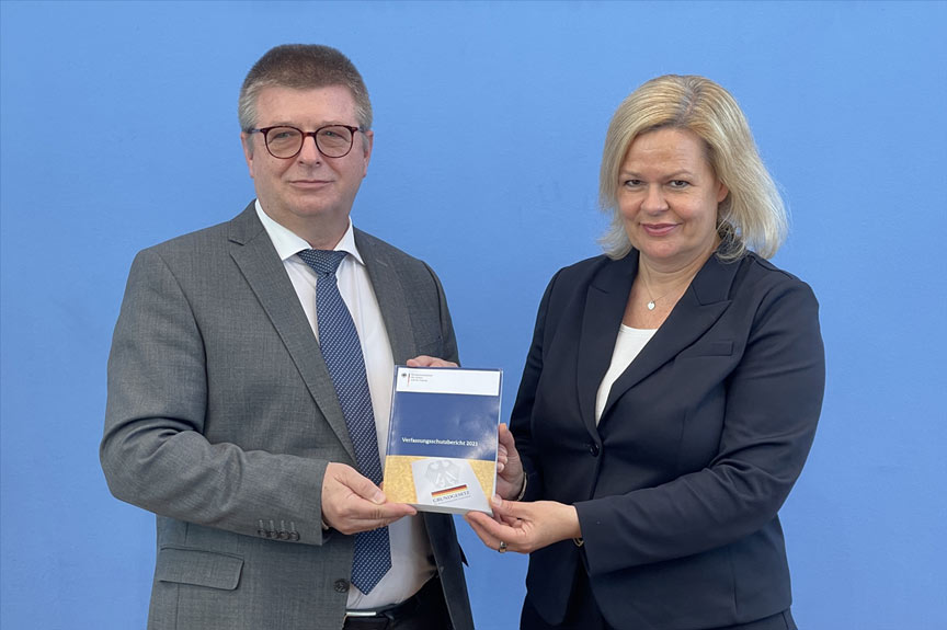 Almanya'da Anayasayı Koruma Teşkilatının 2023 yılı durum raporunda, bu ülkede aşırı sağcıların ve terör örgütü PKK üyelerinin sayısında artış görüldüğü bildirildi. Almanya İçişleri Bakanı Nancy Faeser ve Anayasayı Koruma Teşkilatı (BfV) Başkanı Thomas Haldenwang tarafından başkent Berlin'de ortak basın toplantısıyla kamuoyuna açıklanan 2023 raporunda, aşırı sağcı grupların göç ve uluslararası çatışma korkularını kullanarak destek tabanlarını genişlettikleri vurgulandı. Thomas Haldenwang, ülkede 2022 yılında 38 bin 800 aşırı sağcı tespit edildiğini belirterek, "Almanya'daki potansiyel aşırı sağcı sayısı geçen yıl bir önceki yıla göre yüzde 4,6 artışla 40 bin 600'e yükseldi. Şiddet yanlısı olarak sınıflandırılanların sayısı ise yüzde 3,6 artışla 14 bin 500'e yükseldi" dedi.