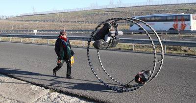 Almanya'dan geçen yıl dev bir çemberle yola çıkan İranlı cimnastikçi Sadatolhosseini, 7 bin kilometre yol yürüyerek İran'a ulaşmayı hedefliyor. Almanya'dan barış mesajı vermek üzere geçen yıl dev çemberle yola çıkan İranlı cimnastikçi Shahin Tivay Sadatolhosseini, eşyalarını ve valizlerini içerisine koyduğu çemberi çevirip barış mesajları vererek seyahat ediyor. Almanya'dan 11 ay önce yola çıkan İranlı Sadatolhosseini, Çekya, Macaristan, Romanya ve Bulgaristan rotasını takip ederek Dereköy Sınır Kapısı'ndan Türkiye'ye giriş yaptı. 44 yaşındaki Sadatolhosseini, içine eşyalarını koyduğu ve hamak asıp uyuduğu iki metre çapındaki cimnastik çemberini çevirerek Çerkezköy'e ulaştı. Sadatolhosseini, AA muhabirine, 13 yaşında siyasi nedenlerle ayrıldığı İran'ı görmek için yıllar sonra çemberiyle yola çıktığını söyledi. Cimnastik öğretmeni olduğunu, 31 yıldır anne ve kardeşiyle Almanya'da yaşadığını anlatan Sadatolhosseini, barış mesajını vermek için yola düştüğünü belirtti.