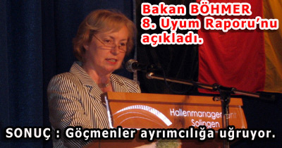Uyum raporu ile ilgili olarak konuşan Böhmer: ' Göçmenlere eşit hak ve fırsat verilmiyor. Bu konuda daha fazla çaba sarf etmemiz gerekiyor. Son rapora göre Almanya’da diploma sahibi olmayan göçmenlerin oranı %13 olarak ifade ediliyor. Bu oran yüksek bir oran. Buna karşılık olarak liseyi bitiren ve üniversiteye gitmeye hak kazananların oranı % 1 oranında arttı. Çocuklara erken yaşta Almanca öğretilmeli.' dedi.