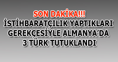 TÜRKLER HAKKINDA ARAŞTIRMAK YAPMAK CASUSLUK SUÇU OLDUHessen ve NRW Eyaletlerinde savcılık MİT adına casusluk yaptıkları ve Almanya'daki Türkler hakkında bilgi edinerek bunları MİT'e verdikleri iddiasıyla yaşları 33 ile 58 arasında değiştiği belirtilen 3 Türk'ün gözaltına alındıkları bildirildi. Süddeutsche Zeintung'un haberine göre 58 yaşındaki Muhammed Taha G.