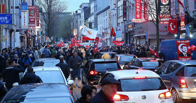 Burada büyük bir Türk bayrağı açan vatandaşlar "Recep Tayyip Erdoğan", "Dik dur eğilme gurbetçiler seninle" ve "Ya Allah bismillah, Allah-u ekber" sloganları attı. Sevinç gösterisinde bulunan vatandaşlar kutlamanın sonunda dua etti. Bu arada güvenlik güçlerinin çevrede geniş güvenlik önlemleri aldığı gözlendi. Vatandaşlar, daha sonra araçlarına binerek korna çaldı ve Türk bayraklarını sallayarak şehir turu attı.