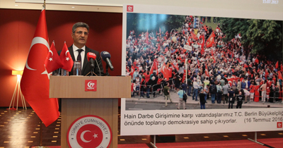 Büyükelçi Aydın, hain darbe girişiminin Almanya'da yeterince anlaşılamamasını üzüntüyle karşıladıklarını vurgulayarak, şöyle devam etti: ''Ülkemizde darbe girişimi sonrası yaşanan gelişmelerin ve FETÖ’nün gerçek yüzünü Alman komşularımız ve dostlarımız tarafından yeterince doğru bir şekilde anlaşılmadığını üzüntüyle takip ettiğimizi de belirtmek isterim. Bütün çabalarımıza rağmen Alman siyasilerin ve kamuoyunu yönlendiren Alman medyasının şimdiye kadar bizi duymak istemediğini ve gerçeklere gözlerini kapadığını, Türkiye hakkında çoğunlukla peşin hükümlü davrandığını, empati ve anlayıştan uzak bir tutum ortaya koyduğunu sizler de çok iyi biliyorsunuz. Türkçemizde güzel bir söz vardır; Dost kötü günde belli olur. Dostlarımızdan ülkemizin bu zorlu mücadelesinde yanımızda olmalarını haklı olarak bekliyoruz. Türkiye’deki darbe girişimine destek veren, bunda payı ve rolü olan terör örgütü mensuplarına burada barınma imkanı sağlanmasını kabul etmiyoruz. Bu durumun hiçbir haklı ve makul gerekçesi yoktur. Dostlarımızdan demokrasiye destek için verilen sözleri darbecilerin yargılanmalarını sağlayacak eylemlere göstermelerini bekliyoruz.’'