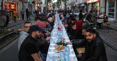 Almanya'nın Köln kentinde aşırı sağcı NSU terör örgütünün 2004'te bombaladığı ve 22 kişinin yaralandığı Keup Caddesi'nde verilen iftara yaklaşık bin 500 kişi katıldı. Almanya'nın Köln kentinde bundan tam 13 yıl önce 22 kişinin yaralandığı bombalı saldırının hedefi olan Keup Caddesi'nde iftar programına katılan Türk vatandaşları ve Almanlar terörün her türlüsüne karşı birlik ve beraberlik mesajları verdi. Almanya'da 8'i Türk 10 kişinin ölümüne neden olan aşırı sağcı Nasyonal Sosyalist Yeraltı (NSU) terör örgütünün 9 Haziran 2004 tarihinde bombaladığı Keup Caddesi'nde iftar verildi. "Küçük İstanbul" olarak da bilinen caddedeki saldırının 13'üncü yılında düzenlenen iftar için 480 metre uzunluğunda masalar kuruldu.