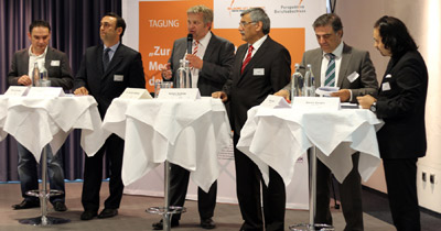 'Perspektive Berufsabschluss' Programı koordinatörlerinden Stephanie Brauser-Jung, projenin federal düzeydeki yansımalarını ele alırken, Federal İş Ajansı Kuzey Ren Vestfalya Ealet Direktörlüğü Göçmenler Dairesi Başkanı Sefer Öncel, konuşmasında projenin bölgesel etkilerini değerlendirdi. Almanya’da faal Türk medya kuruluşlarının yöneticileri iki oturumda meslek eğitimine bakış açılarını ortaya koyarken, bu alandaki iyileştirmeler için önerilerini sundular. Federal düzeyde faal yayın kuruluşlarının yöneticilerinin yer aldığı ilk oturumda Hürriyet adına Halit Çelikbudak, İhlas Medya Grubu adına Kenan Kubilay, World Medya Grubu adına Mustafa Altaş, Sabah Grubu adına Mikdat Karaalioğlu, Kanal Avrupa adına Seran Sargur ve Radyo Metropol adına Tamer Ergün konuşurken, ikinci oturumda Kuzey Ren Vestfalya’da yayın yapan Türkçe medya kuruluşlarının yayın yönetmenleri yer aldı. Bu oturumda Ahmet Salıncaklı Aktuell Gazetesi’ni, Alaattin Bayrak Haftalık Posta’yı, Cengiz Parlayan Mozaik’i, Hayrettin Özcan NRW Haber’i Ramazan Kabataş Post Gazetesi Ruhr Baskılarını ve Tuğrul Alp Öztürk Öztürk Gazetesini temsil etti.