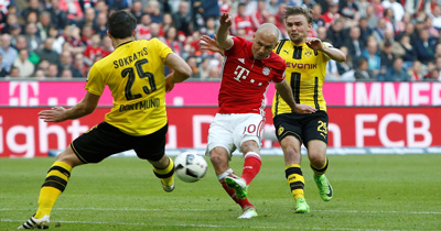 Almanya Birinci Futbol Ligi'ndeki (Bundesliga) 28. hafta mücadelesinde Bayern Münih, konuk ettiği Borussia Dortmund'u 4-1 yendi. Allianz Arena'da oynanan karşılaşmaya etkili başlayan Bayern Münih, 4. dakikada Franck Ribery ve 10. dakikada Robert Lewandowski'nin attığı gollerle 2-0 öne geçti. Borussia Dortmund, Raphael Guerreiro'nun 20. dakikada fileleri havalandırması sonucu farkı bire indirdi ve ilk yarı ev sahibi takımın 2-1'lik üstünlüğüyle sona erdi. Bavyera temsilcisi, Arjen Robben'in 49. dakikada kaydettiği golle skoru 3-1 yaptı. Maçın 68. dakikasında bir kez daha sahneye çıkan Lewandowski, kazanılan penaltı vuruşunu gole çevirerek kendisinin ikinci, takımının dördüncü golünü attı: 4-1. Kalan dakikalarda başka gol olmadı ve Bayern Münih müsabakadan 4-1 galip ayrıldı.