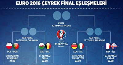2016 Avrupa Futbol Şampiyonası'nda (EURO 2016) son 16 turu maçları tamamlandı ve çeyrek finalde karşılaşacak takımlar belli oldu. Fransa'da düzenlenen EURO 2016'da 2 gün aranın ardından çeyrek finalde şu müsabakalar oynanacak: