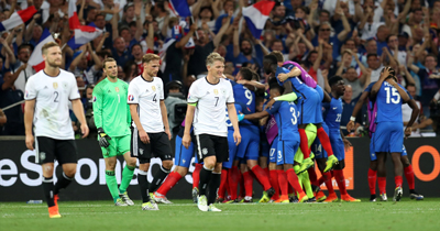 2016 Avrupa Futbol Şampiyonası (EURO 2016) yarı finalinde Fransa, Almanya'yı 2-0 yenerek finalde Portekiz'in rakibi oldu. Almanya'nın yüzde 64 oranla topa sahip olduğu ilk yarıda, golü Fransa buldu. 45+1. dakikada soldan kullanılan köşe vuruşunda, Evra ile birlikte yükselen Schweinsteiger topa elle müdahale edince, hakem Rizzoli penaltı noktasını gösterdi. Bir dakika sonra kullanılan penaltıda Fransız golcü Griezmann, meşin yuvarlakla kaleci Neuer'i farklı köşelere yollayarak takımını 1-0 öne geçirdi ve Fransa, bu skorla soyunma odasına önde gitti.